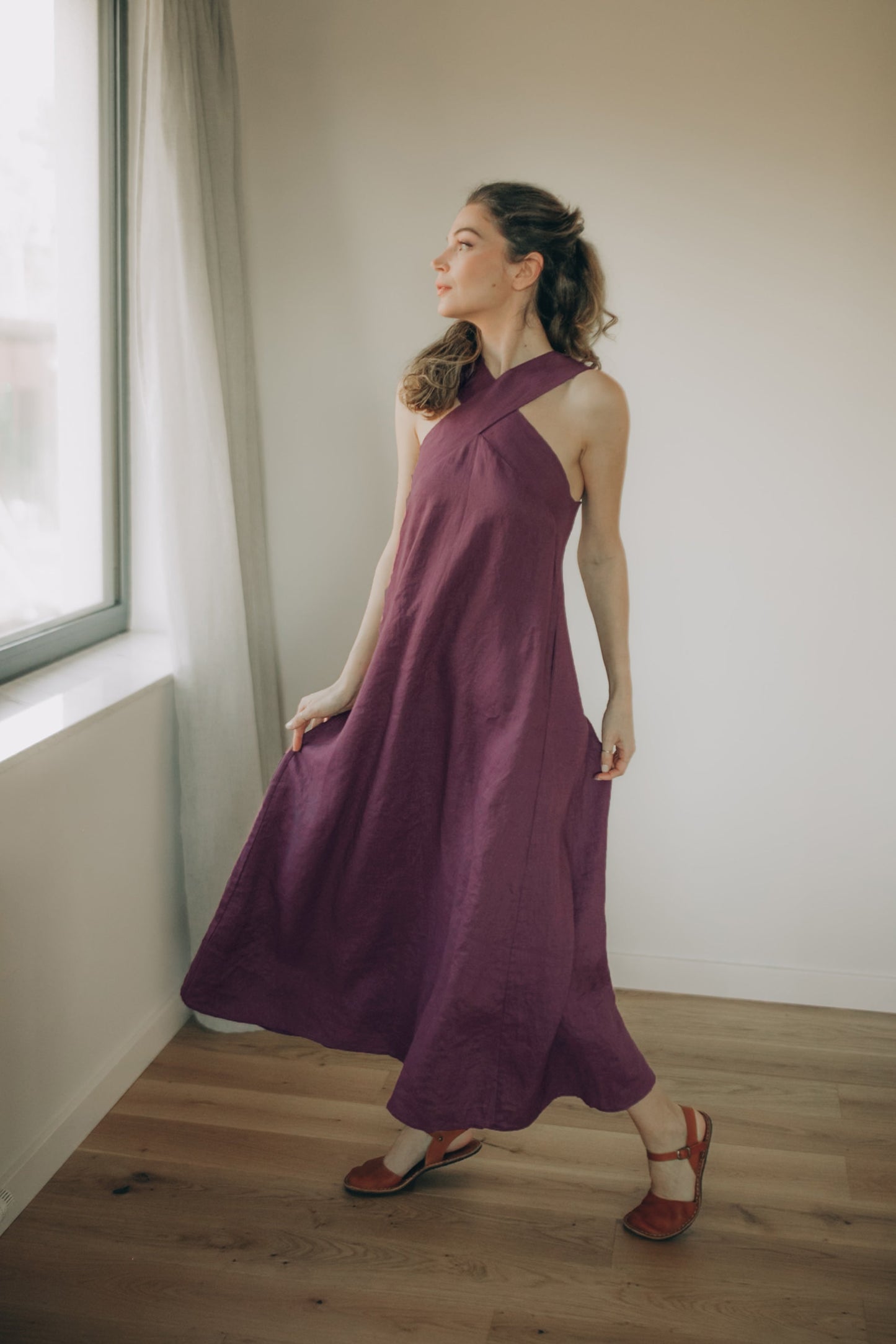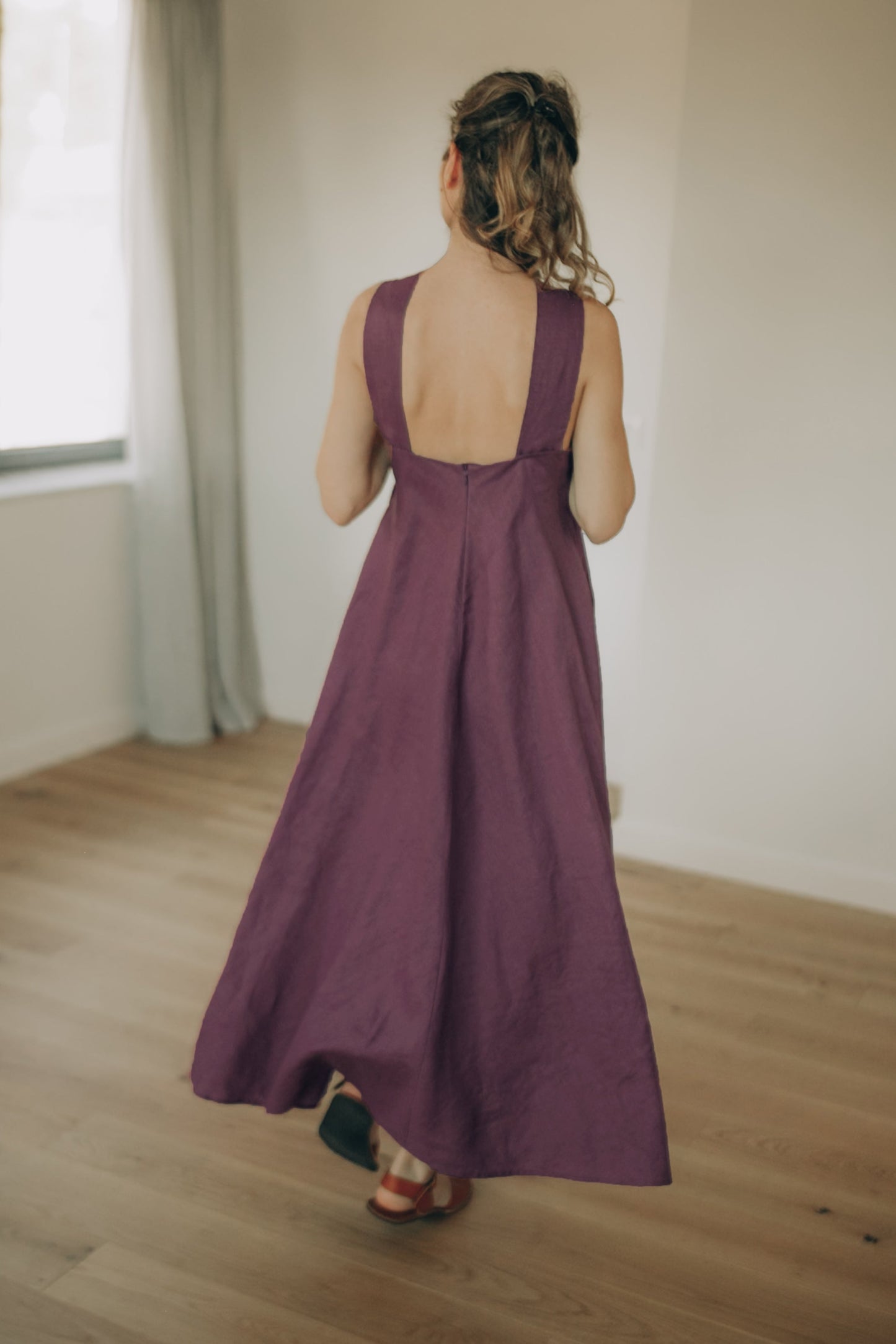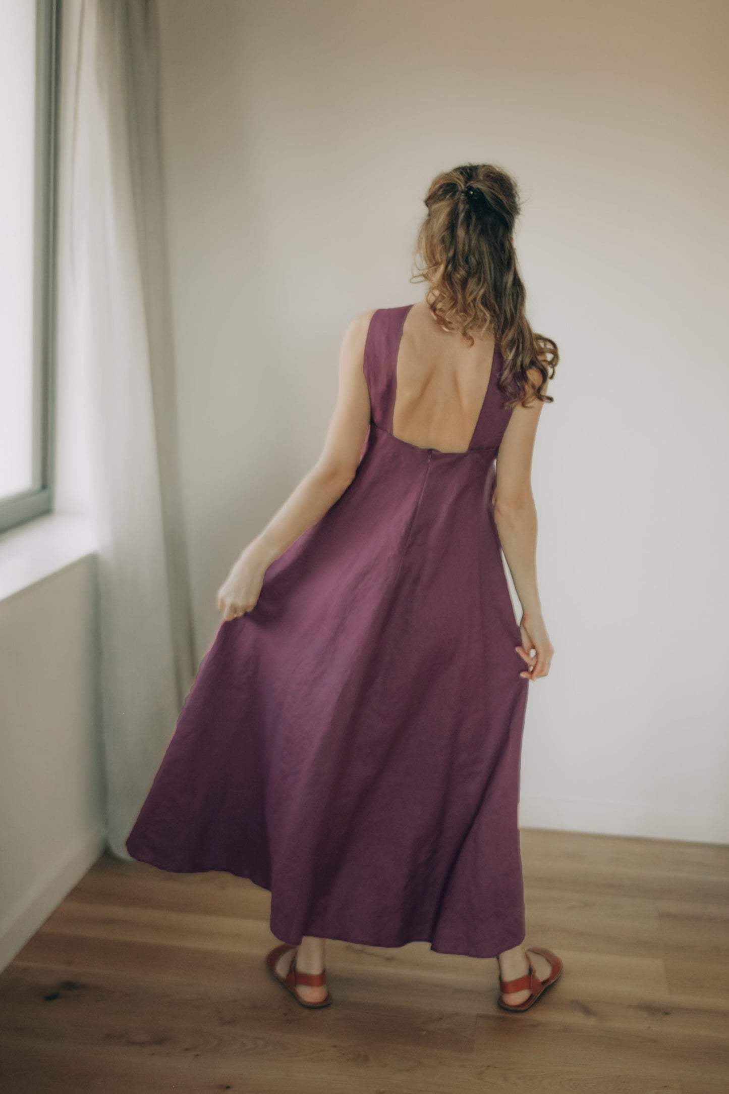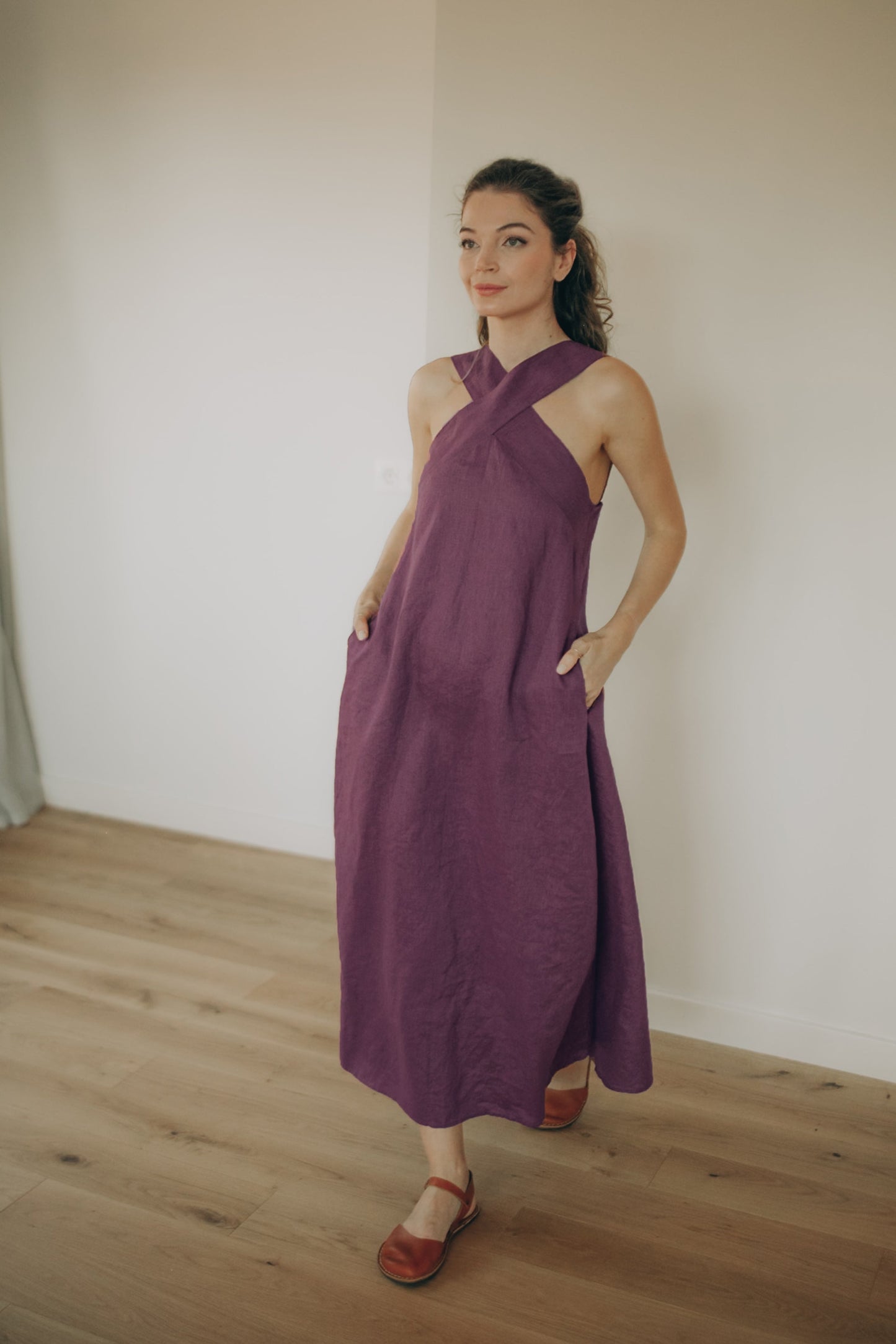 Linen Midi Dress: Cross-Front Neckline, Open Back