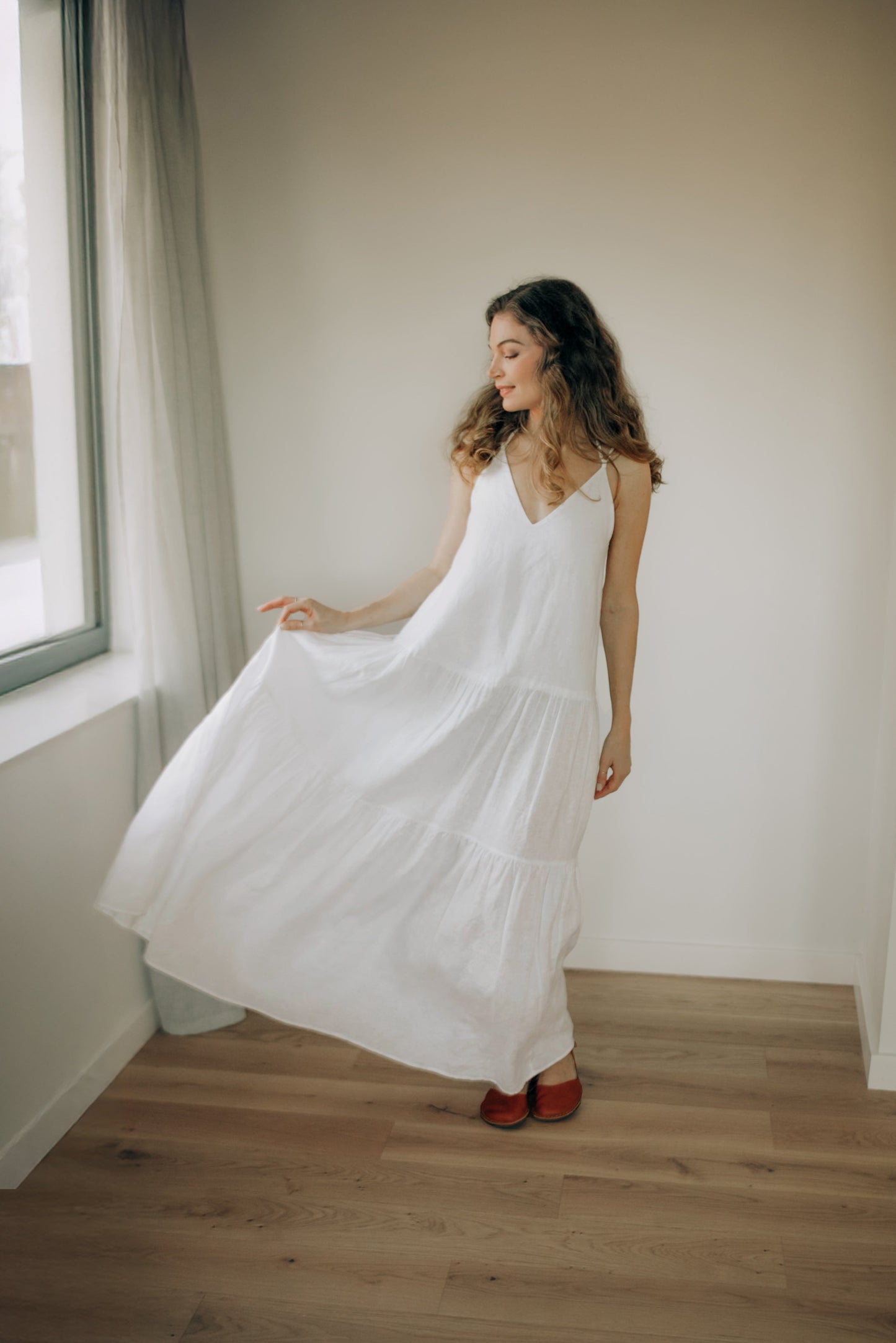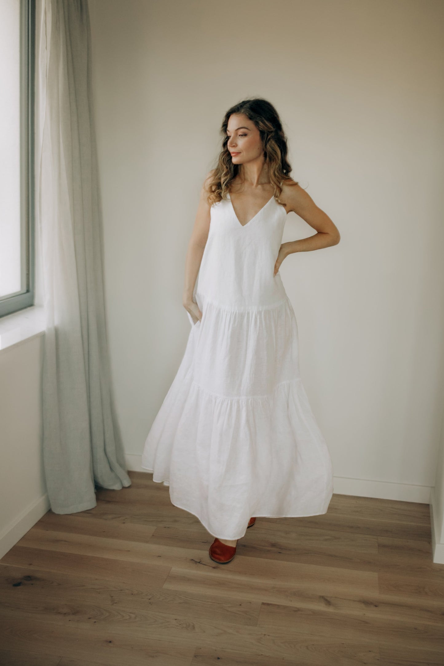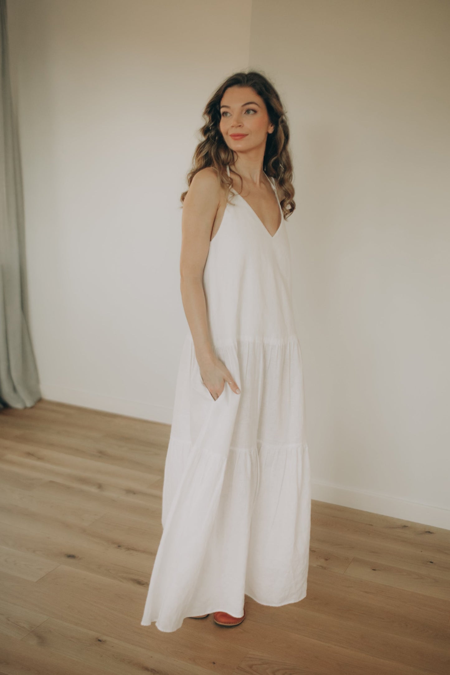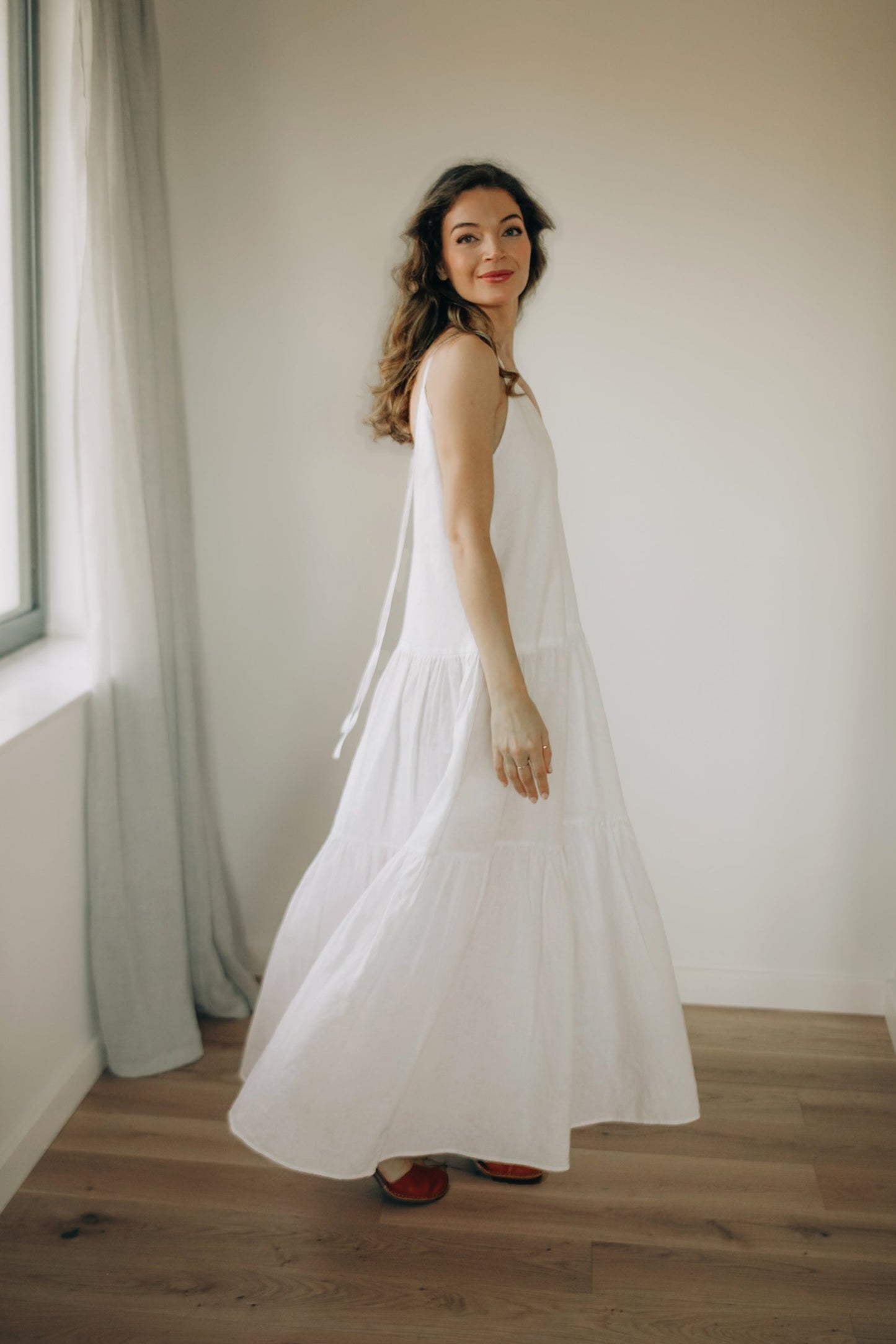 This elegant white tiered linen midi dress combines effortless summer style with comfort and femininity. Made from breathable natural linen, it is lightweight and perfect for warm weather.