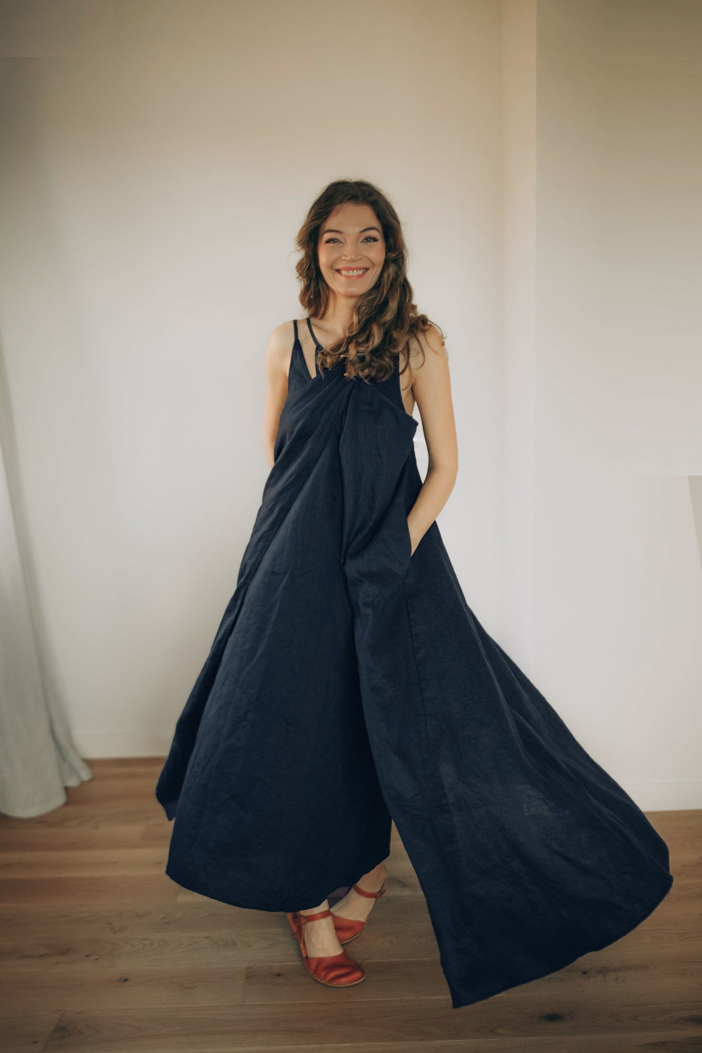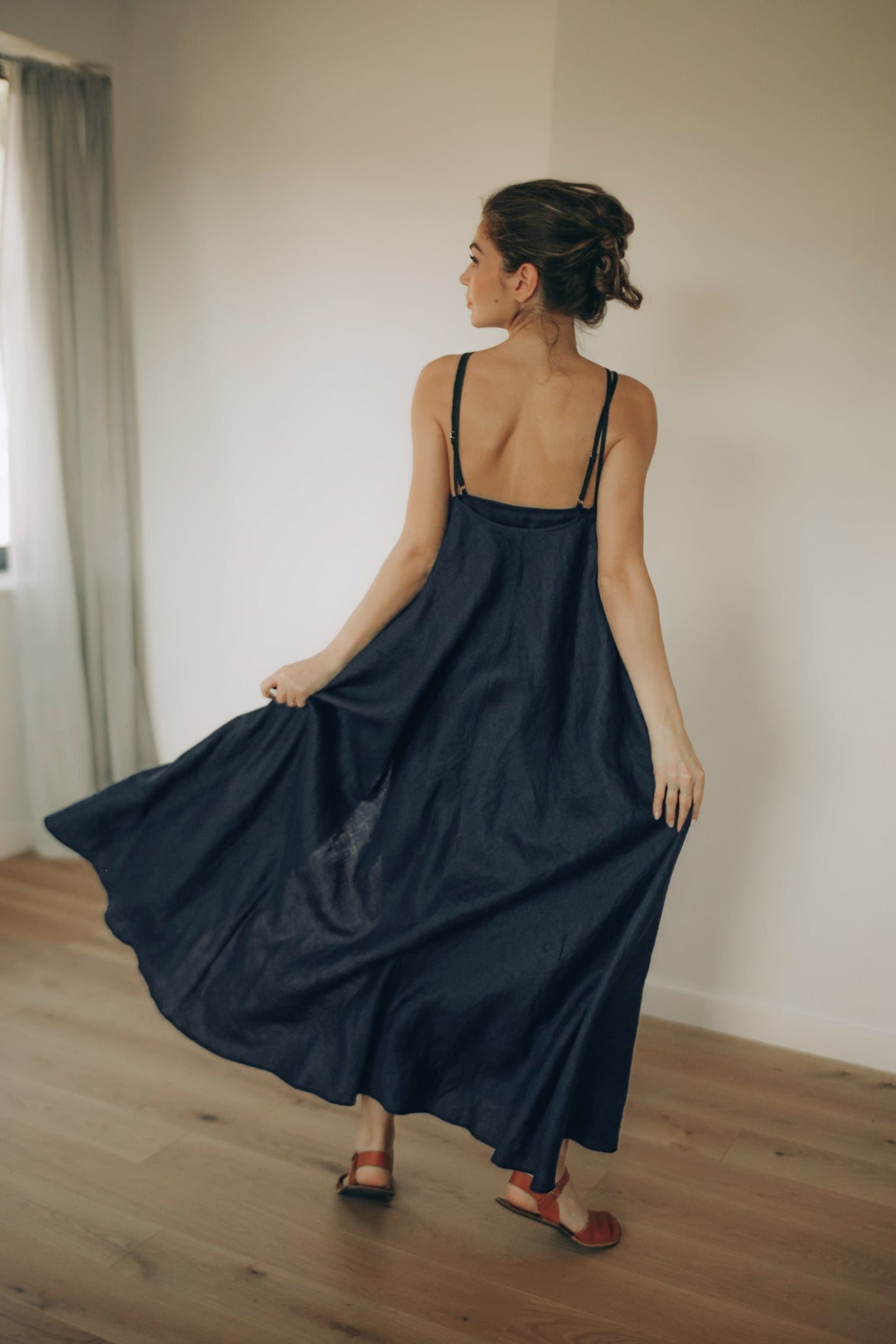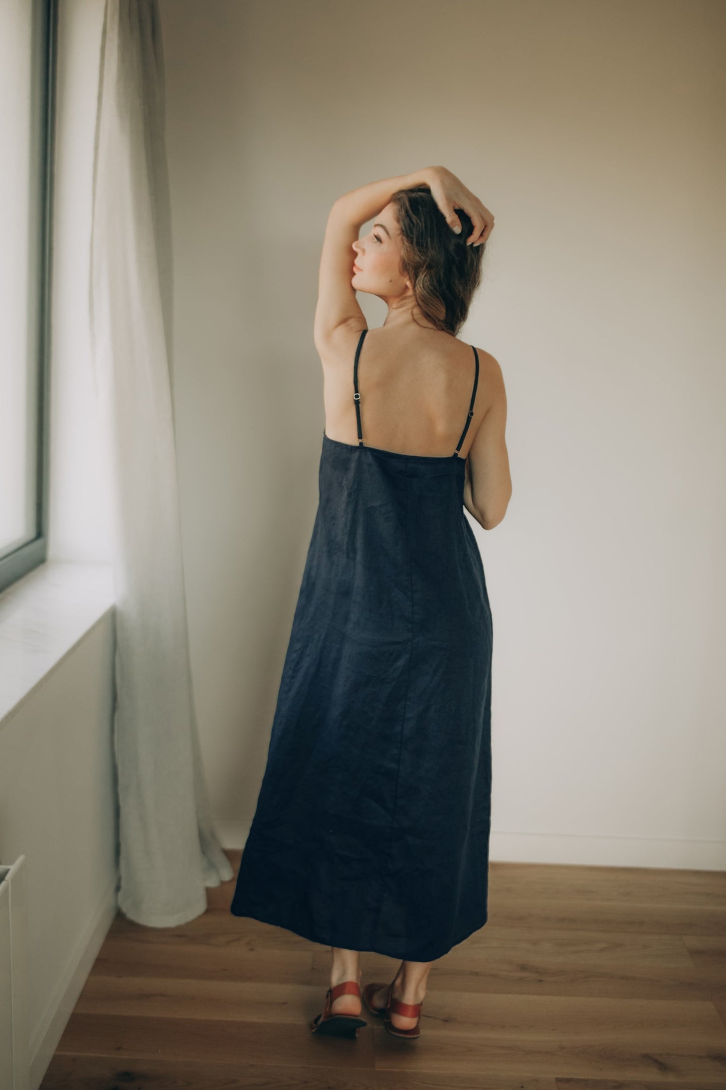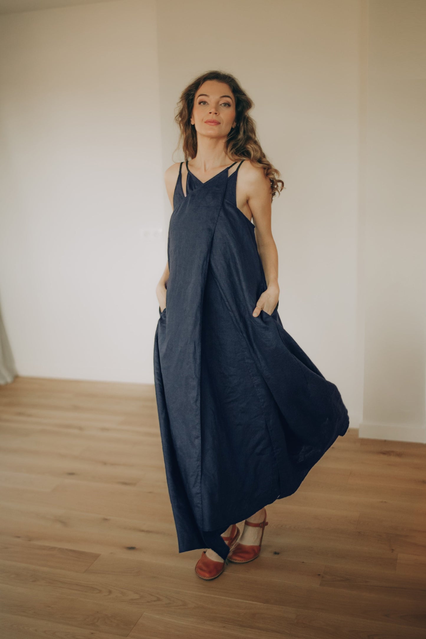 The outer dress features a cross-front neckline and an open back with delicate adjustable straps. Its flowing silhouette moves beautifully, while side pockets add everyday functionality.