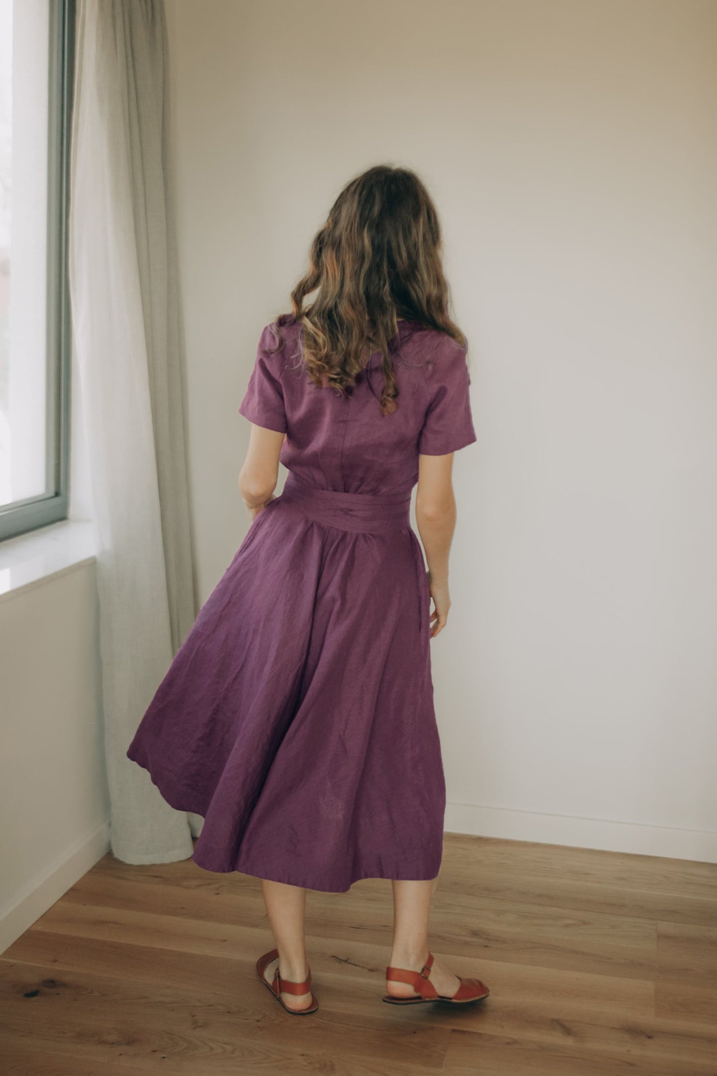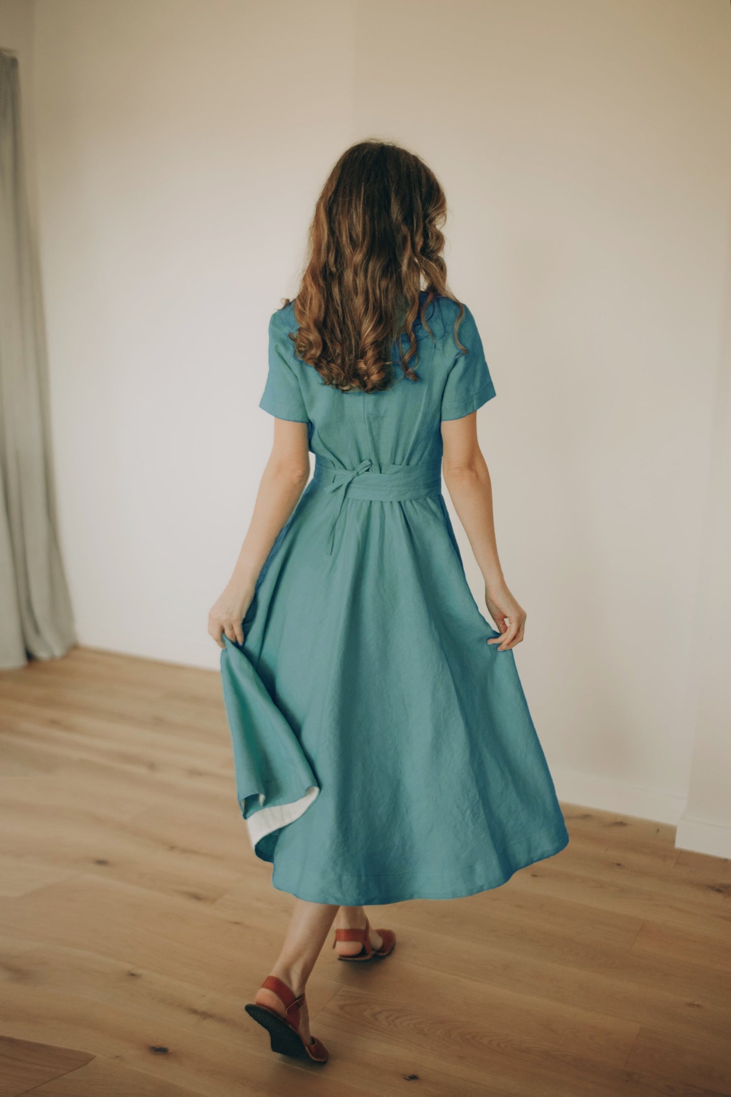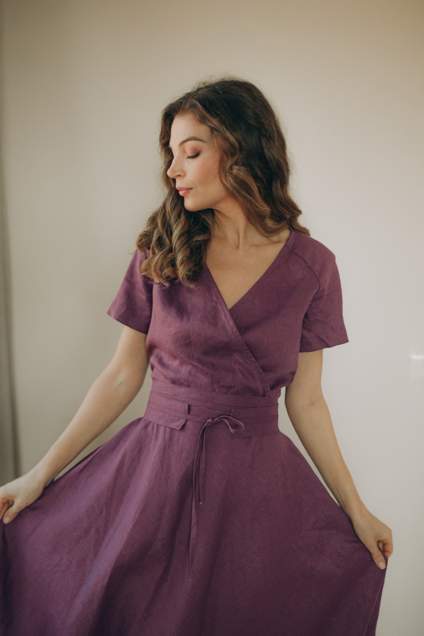 The essential summer faux wrap dress made from 100% high quality linen. This comfortable midi length dress has a surplice neckline, side pockets and а faux wrap closure with a band that emphasizes the waist. This delightful linen piece could be made in a variety of colors.