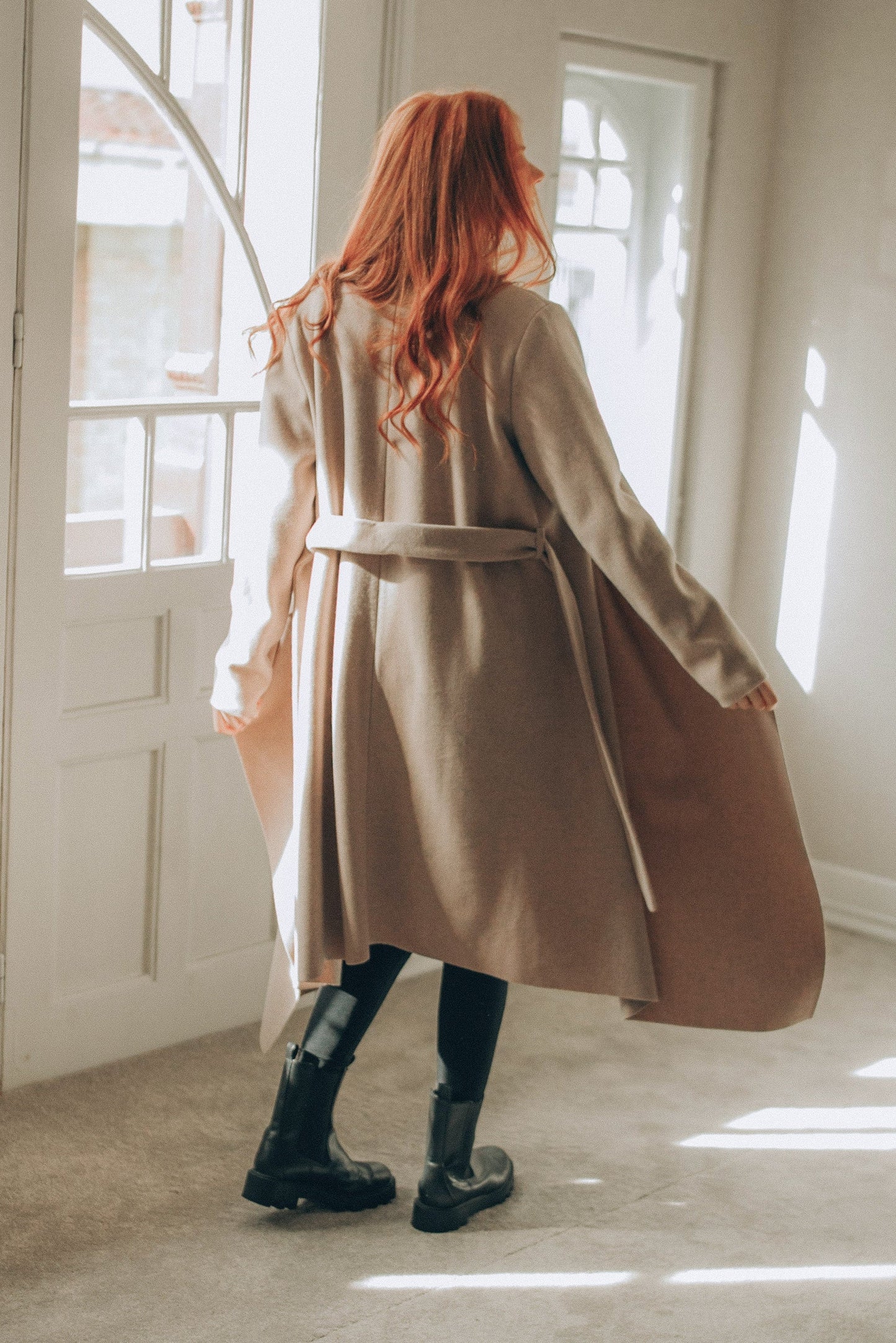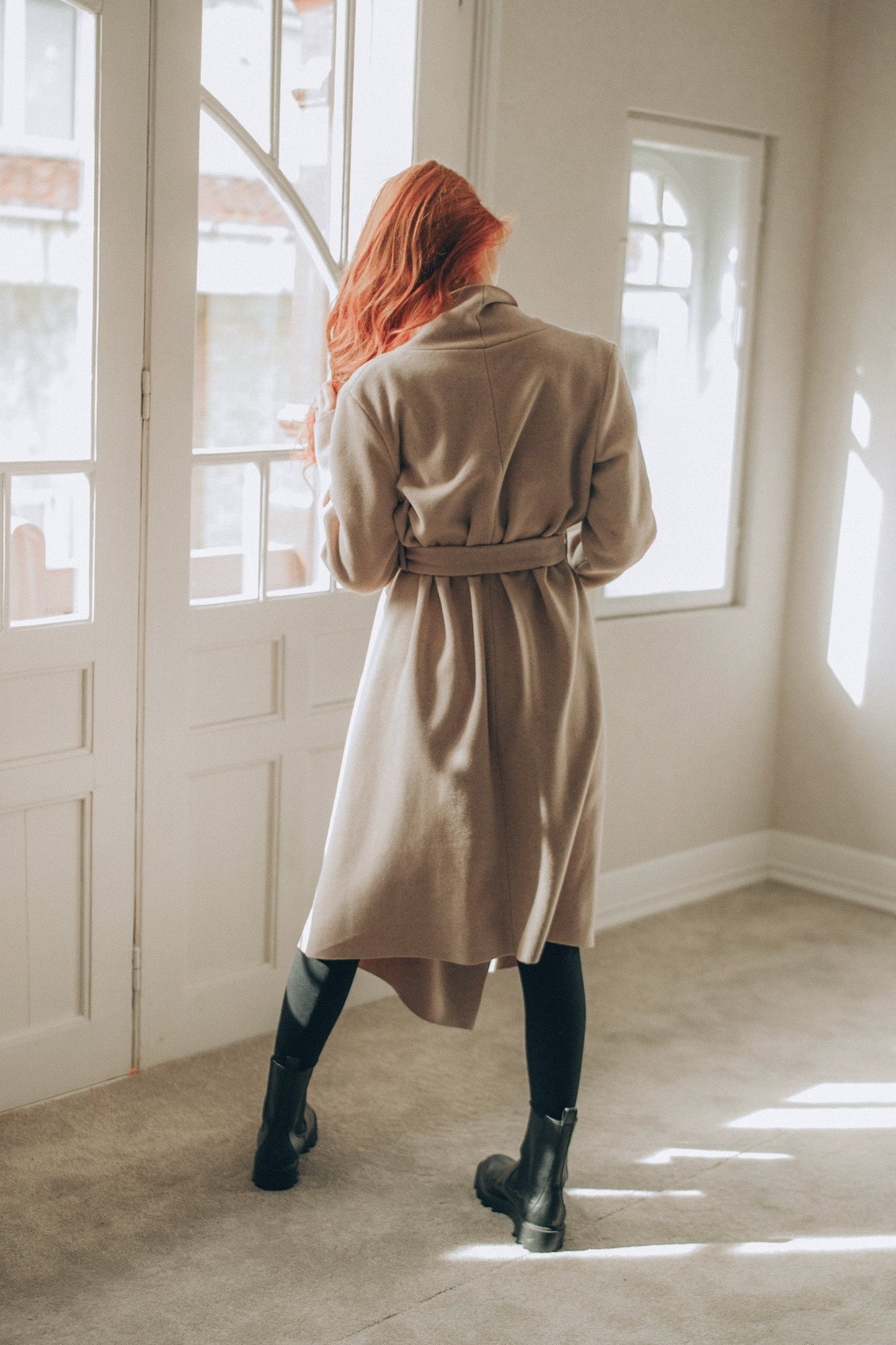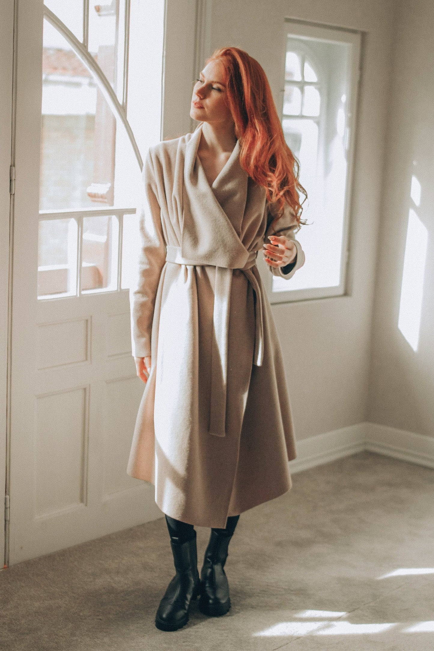 Experience the perfect blend of style and comfort with this powder beige wool cardigan coat, thoughtfully designed for women seeking warmth and elegance. This wool coat features a flowing asymmetrical wrap and a matching belt, making it an essential winter layer that complements both casual and dressy looks. This piece effortlessly elevates your wardrobe with its timeless charm.
