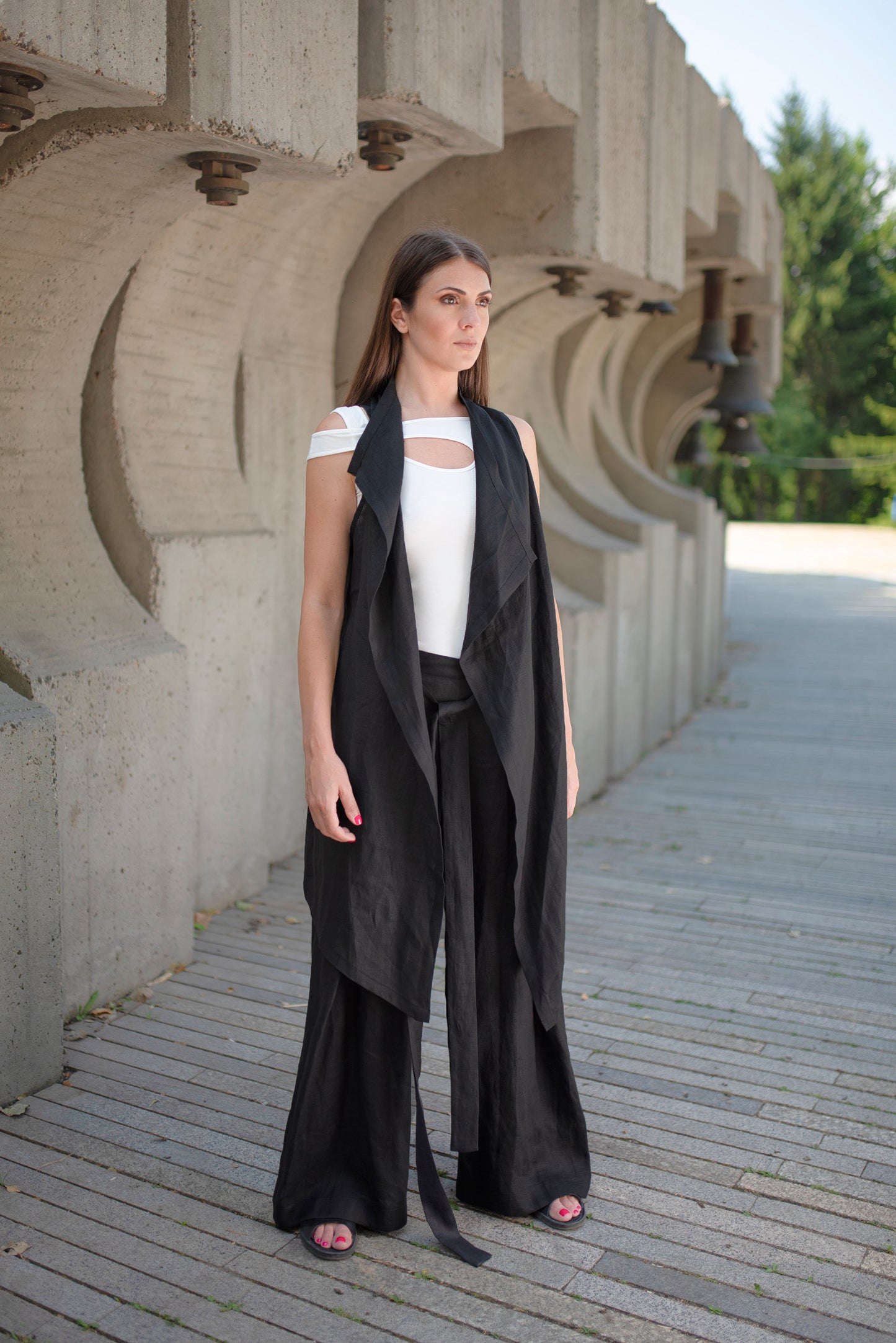 Enjoy the lightness of movement in these cool wrap style linen pants that are breezy and super chic. These wide-leg pull-on pants feature an elastic waistband and a tie front. Pair with the matching asymmetric linen vest for an outstanding, yet comfortable airy linen look. Pictured in black here, these pants are available to order in multiple colors.